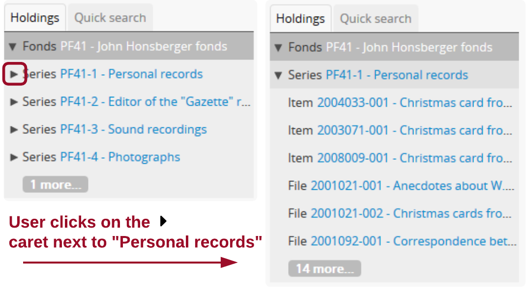 Sidebar treeview states compared - browsing the series in a fonds (left), then browsing the items in a series (right).