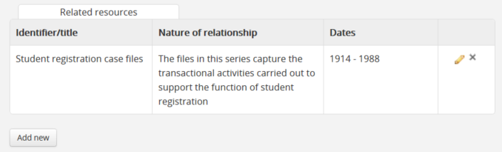 An example of a related archival description, as seen in the Relationships Area when in edit mode. Click “Add new” to create a new relationship.