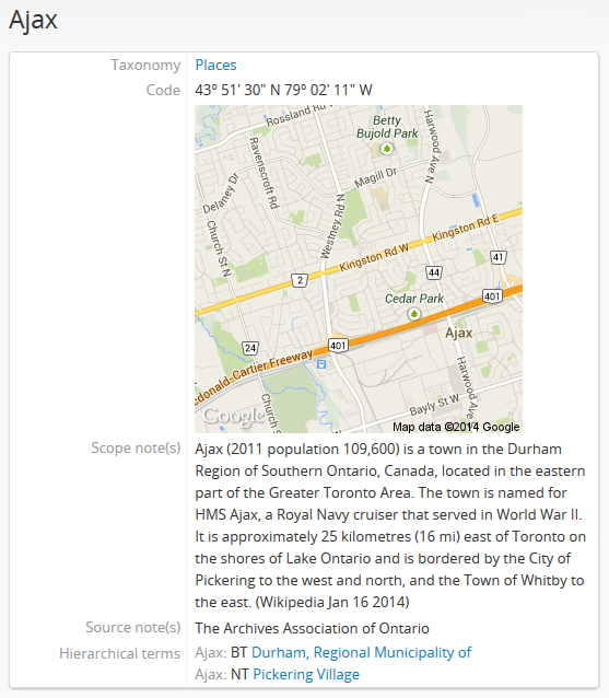 Terms are also used throughout the application as access points, such as subject and place access points added to archival descriptions. The place and subject taxonomies are the two taxonomies that users will likely interact with the most. AtoM’s use of a taxonomy to manage access points allows them to be organized hierarchically, with broader terms, related terms, and narrower terms. This is of particular use for place access points, as all parent terms will appear on a record as a breadcrumb trail when a term is added as an access point - for example, if the term “Vancouver” is added as a place access point to an archival description, and in the Places taxonomy “Vancouver” has the broader (or parent) term of “British columbia”, the access point will appear on the related archival description as “British columbia >> Vancouver”: