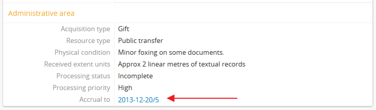 - When viewing the accession record for the accrual, you will notice that in the Administrative information area an “Accrual to” data field shows the related original accession record. The data is a hyperlink that can be clicked to navigate to the original accession record.