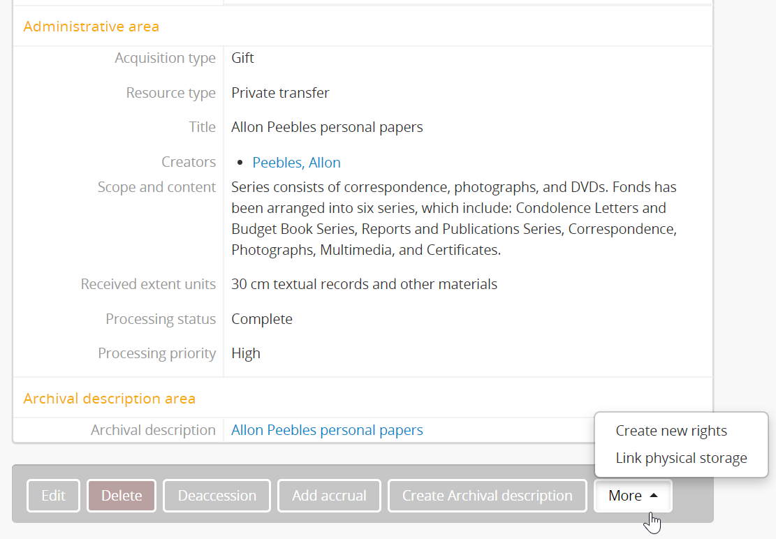 Notice that the linked archival description is now presented as a hyperlink in the accession record.