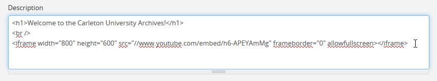 Users can also add custom HTML and inline CSS to an archival institution page, to further customize its content and display. This can be used to add important information (e.g. holiday hours; emergency closures) either temporarily or permanently; to embed external content such as a YouTube video or a locally hosted image; to add shortcuts to custom searches (especially in a multi-repository system such as a network or portal site); and more.
