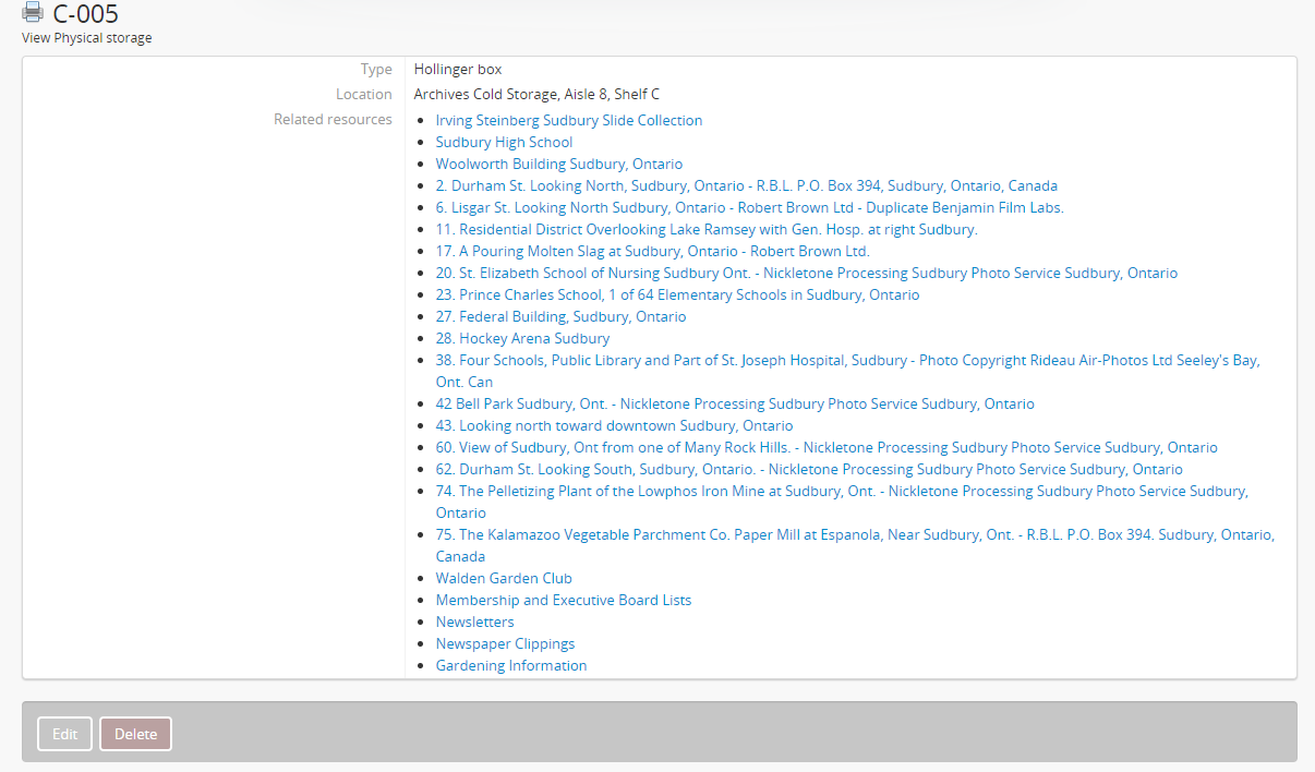 1. Click on the hyperlink container name and AtoM takes you to the View Physical storage screen.
