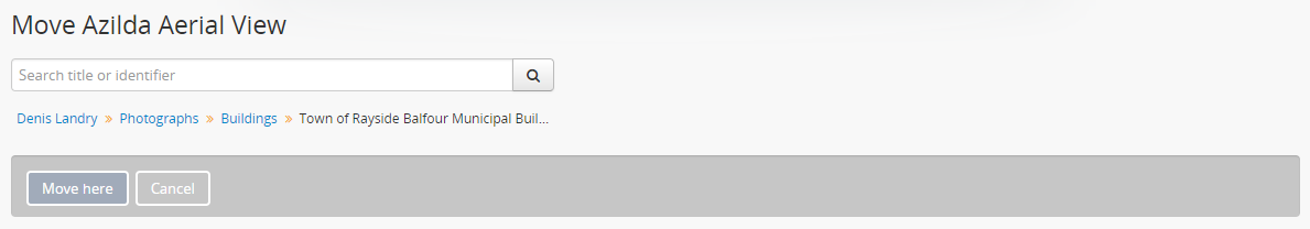 - To find your move location more quickly you can use the Move search bar to bring up results in the Move browse results listed below. For example, if you don’t know the name of a series record but you do know the name of the fonds or collection, you could search for the top-level description and then use the Move browser (below) to navigate to the correct level of description.