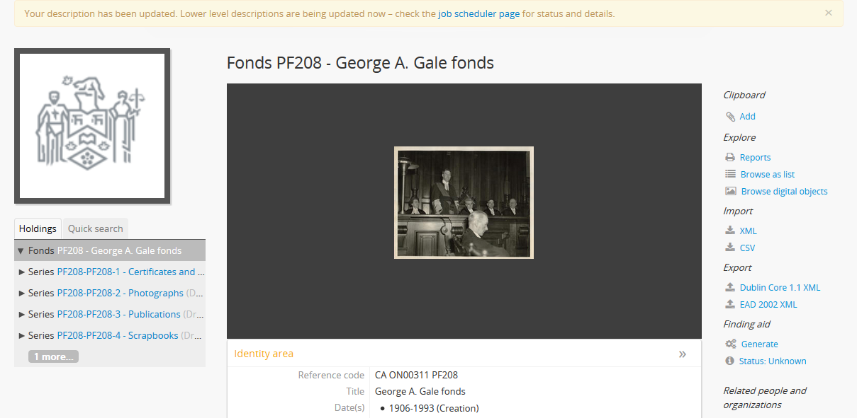 In AtoM, an archival description is a body of information about an archival record or records. The descriptions provide contextual information about the archival materials and are arranged into hierarchical levels (fonds, series, files, items, and variations of these in accordance with institutional standards).