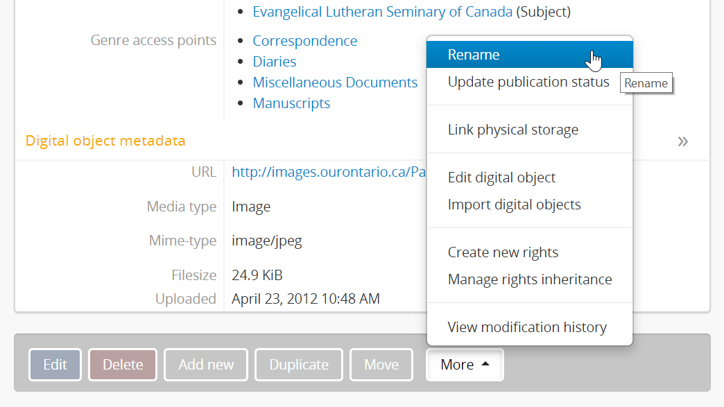 However, users with the appropriate permissions can edit the slug, the title of the description, or even the filename of an associated uploaded digital object after the description is saved, by using the “Rename” module.