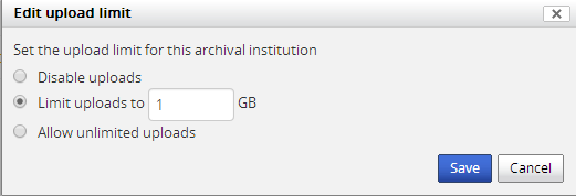 In addition to setting a global limit on the total space available for digital object uploads, an administrator can also set individual upload limits per archival institution, which can be useful when AtoM is used as a multi-repository system. There is also a setting for configuring what the default upload limit is per repository - see below: