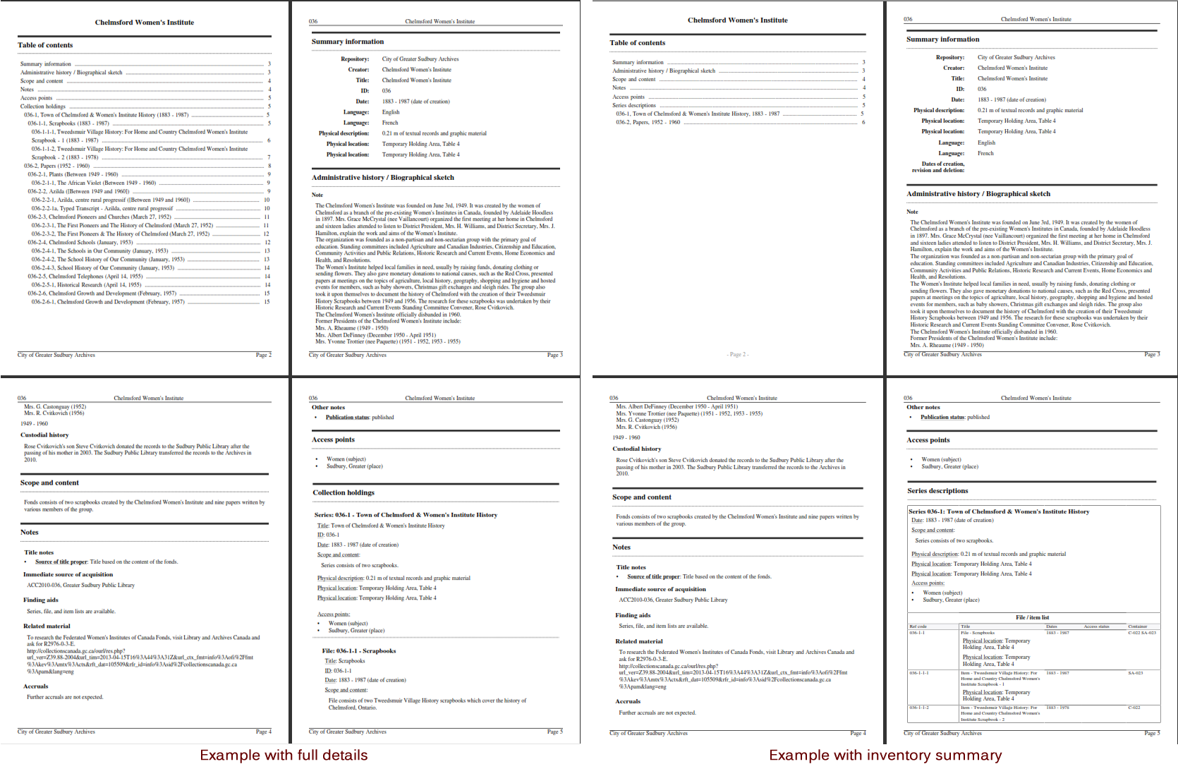 The Inventory summary option is best used when there has been minimal description added to lower levels, such as file and item-level records. AtoM will display these lower levels in a summary table beneath each parent series (or sub-series, etc). The Full details will treat each lower-level record similar to the higher-level ones, and all fields will be displayed. A sample first few pages of each, minus the cover page, has been included in an image below for comparison.