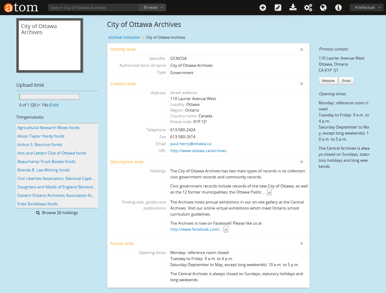 1. Navigate to an existing archival institution in AtoM. You can do this by browsing or by searching for a specific archival institution - see Access content for more information on navigation in AtoM.