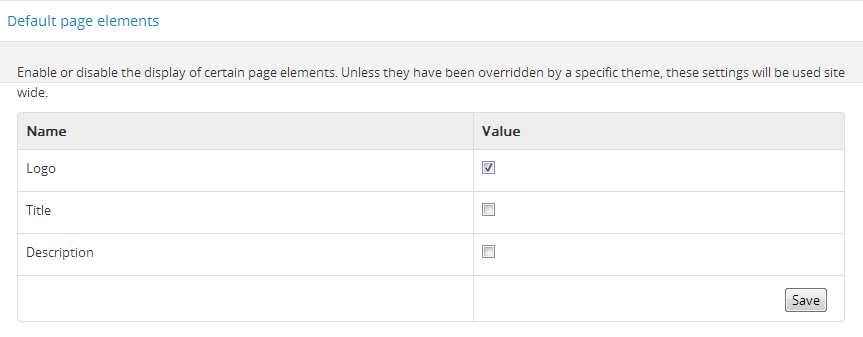 This section allows administrators to enable or disable certain page elements. Unless they have been overridden by a specific theme, these settings will be used site-wide.