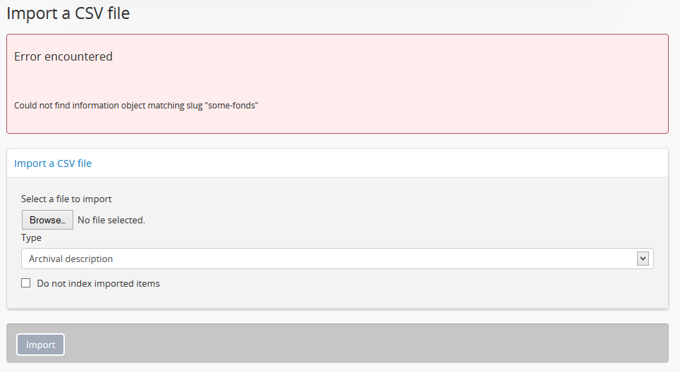 Once you’ve prepared your import, you may want to clone your AtoM site and test your import on the clone before importing to your production AtoM installation. This prevents you from having to delete any improperly imported data. During import testing if you want to delete all imported data you can use the command-line purge tool.
