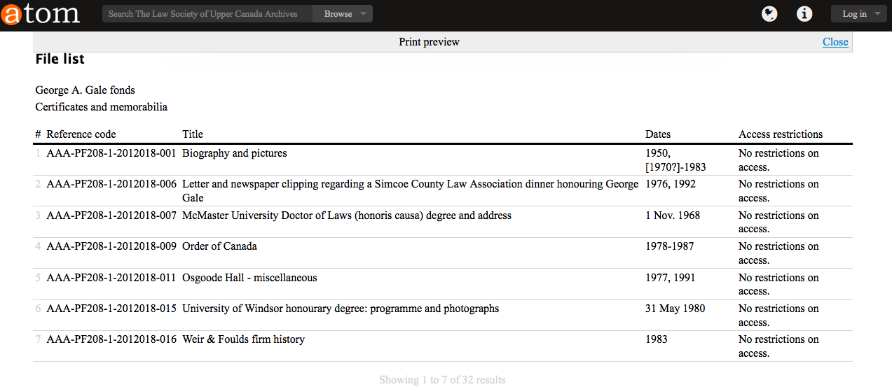 - Select the Continue button and AtoM will load the print preview page for the file list report.