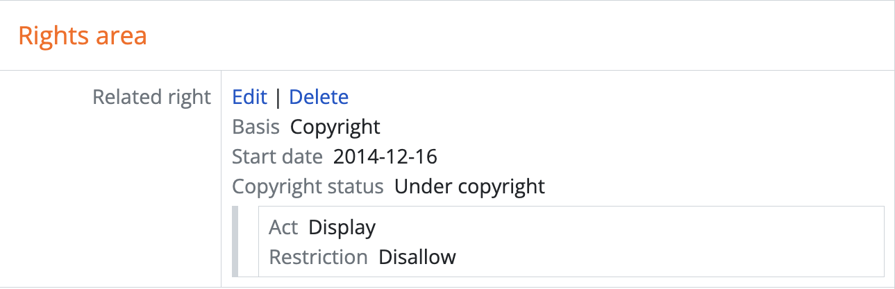 When you click delete, AtoM deletes the rights record without asking for confirmation, so be sure to click only when you are positive you wish to delete the rights information!