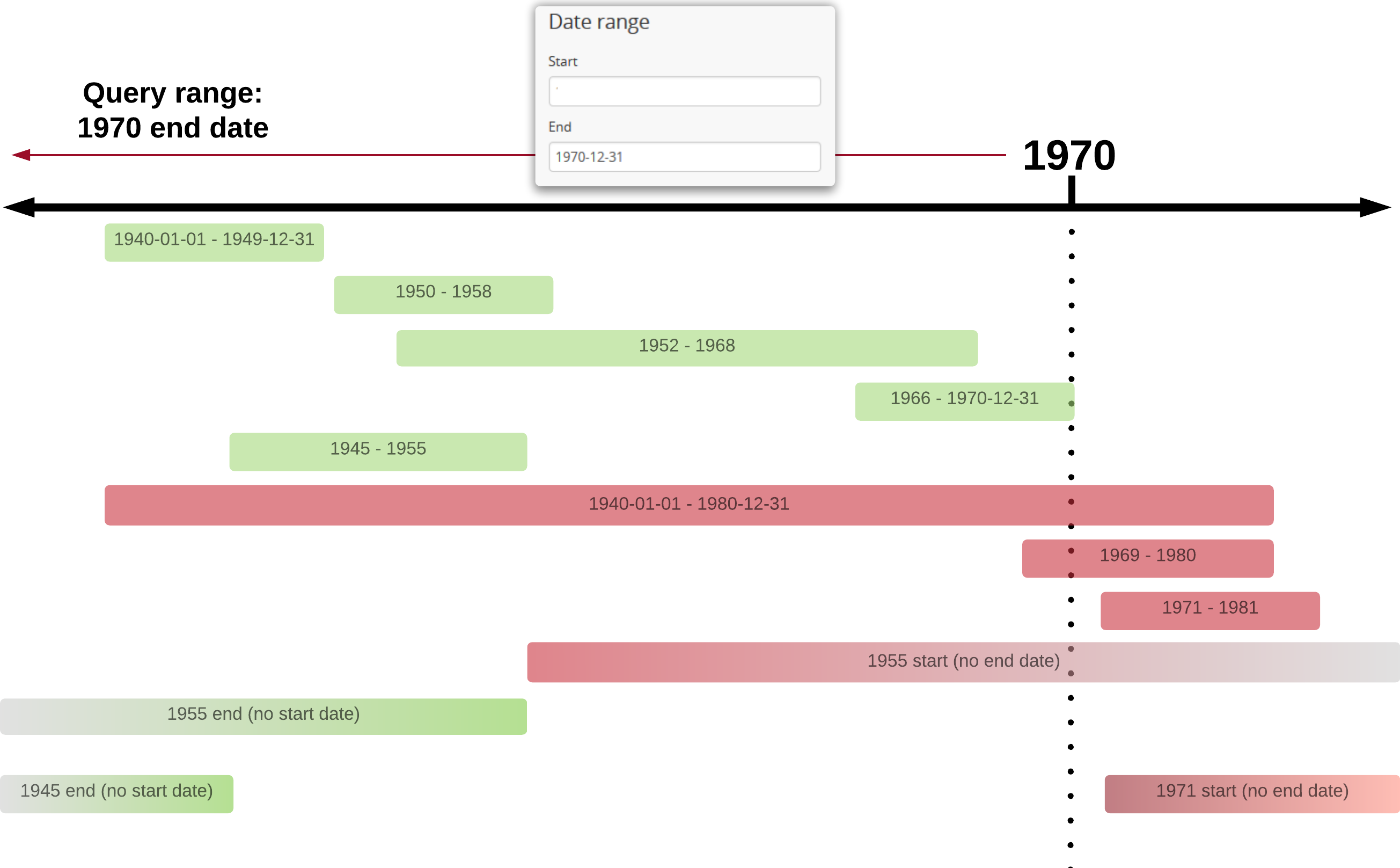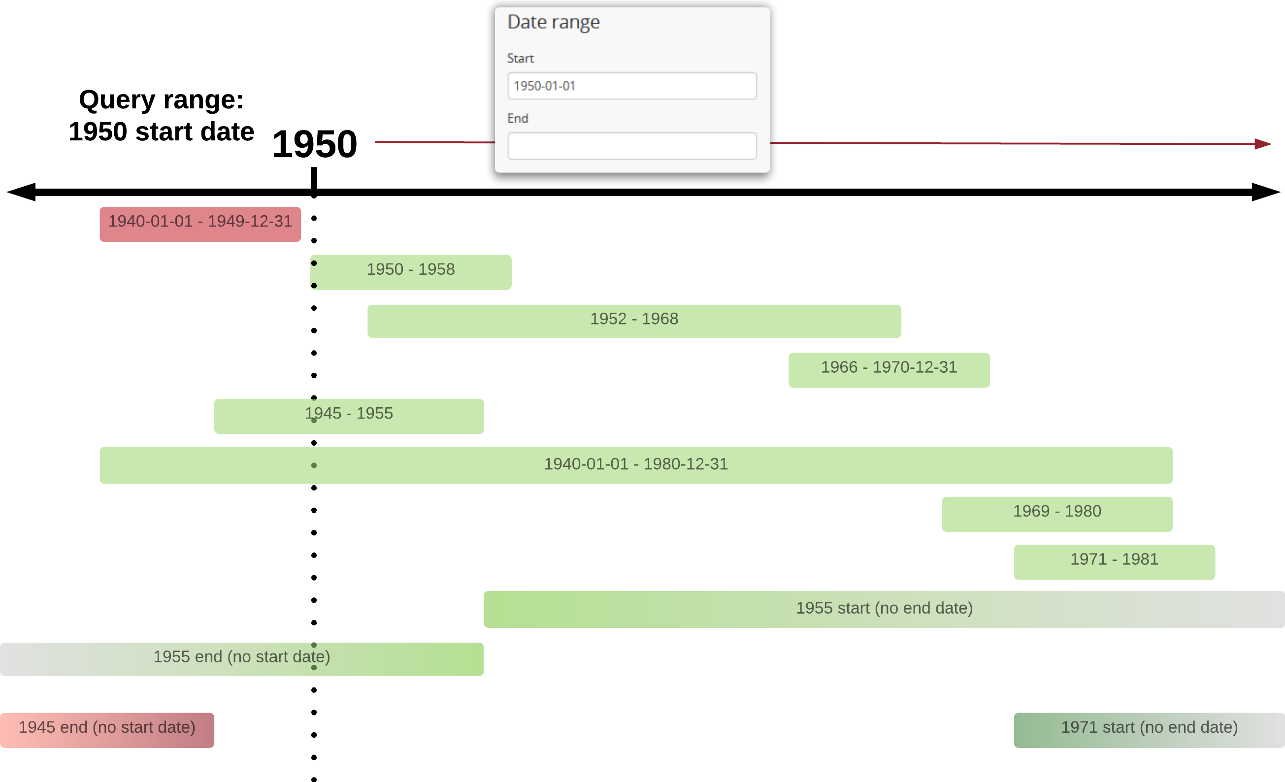 To better clarify these options, some example diagrams have been included below to indicate the difference, illustrating how each option behaves for closed ranges (both start and end date included), and open ranges (where either a start or end date is included, and the second date is left blank). In the following images, results in green will be returned by the search query; results in red will be excluded from the results: