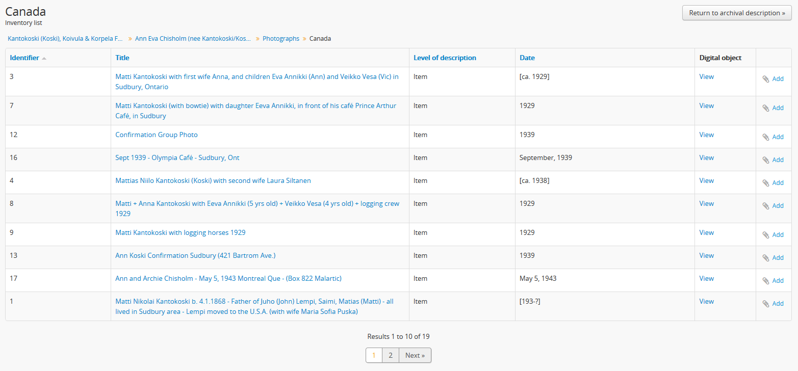1. The Inventory list page will include the title of the parent description, as well as a breadcrumb trail back to the top-level description for the archival unit. On the right-hand side of the page, a button to return to the view page of the parent archival description is also included.