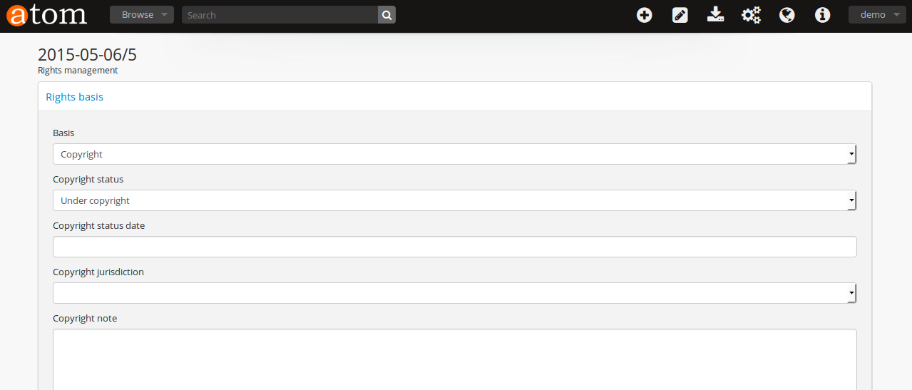 An image of the rights entry page accessed from the accessions edit page
