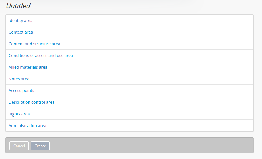 1. You can quit the create process at any time by clicking the “Cancel” button in the button block; any changes made will not be saved. Note that simply navigating away from the page by any other means, without first clicking “Save” will also result in no changes being saved to the archival description.