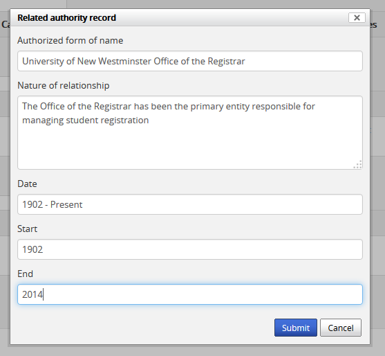 - AtoM will open a pop-up dialog where you can select the related authority record and define the nature and time frame of the relationship.