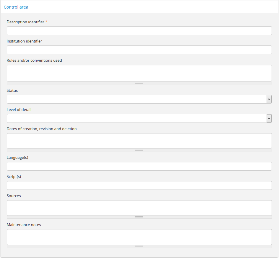 The data entry fields for the Control area of the ISAAR(CPF) authority record template.