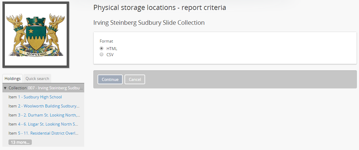 Reports generated this way are particular to the selected archival unit - for storage location reports that show all related descriptions associated with a storage location, see above, Create physical storage report from the Manage menu.