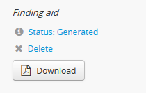 2. The Finding aid section will include a status message indicating whether the current finding aid was uploaded or generated, a Delete link, and a Download button to view the current finding aid: