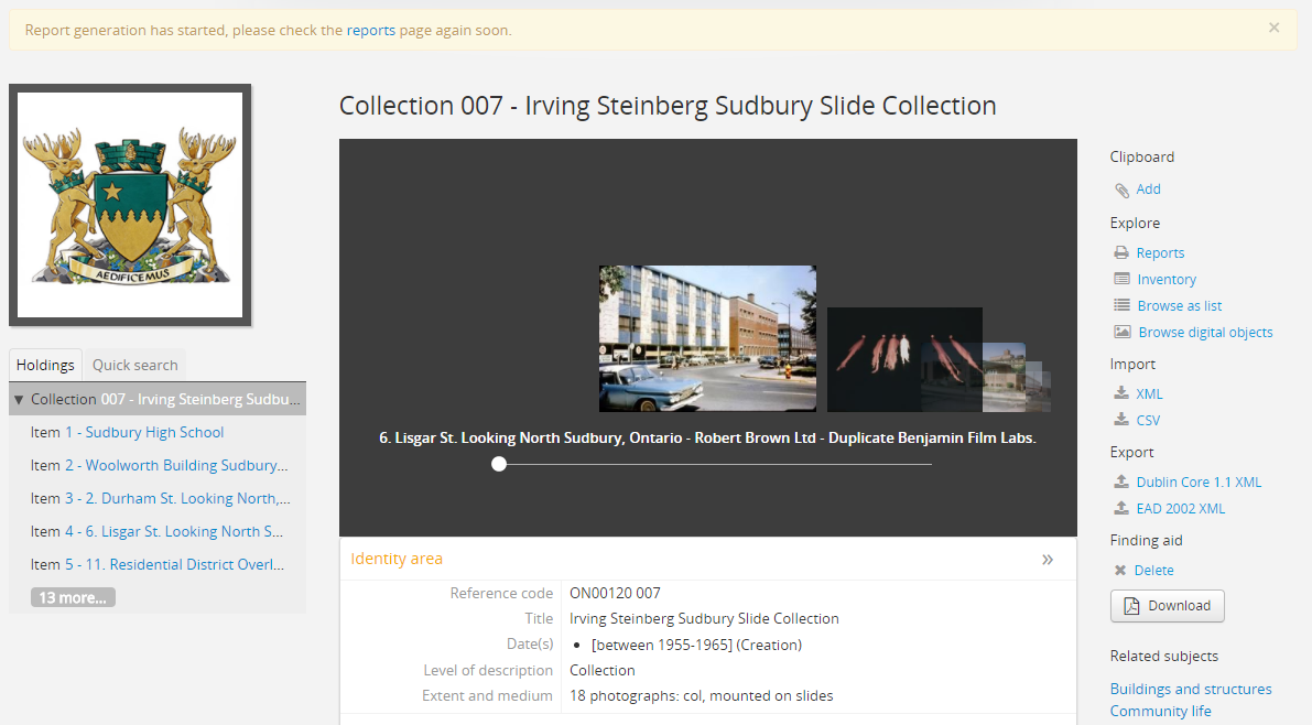 1. Once you have selected a report format and clicked “Continue,” AtoM will reload the page and return you to the view page for the related archival description. A notification will appear at the top of the page, letting you know that report generation has started.