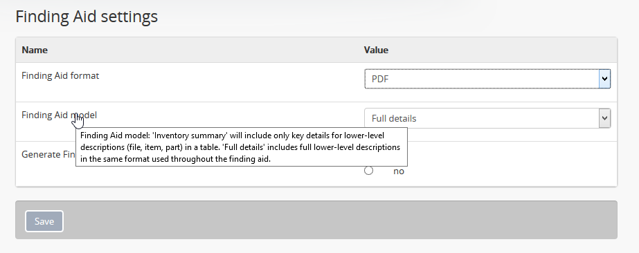 Finding aid model: At present, this setting will change how lower-level descriptions (e.g. children, such as files and items) are presented in the finding aid. You can choose between “Full details” and “Inventory summary.” Hover your cursor over the Finding aid model field label to see a brief tooltip: