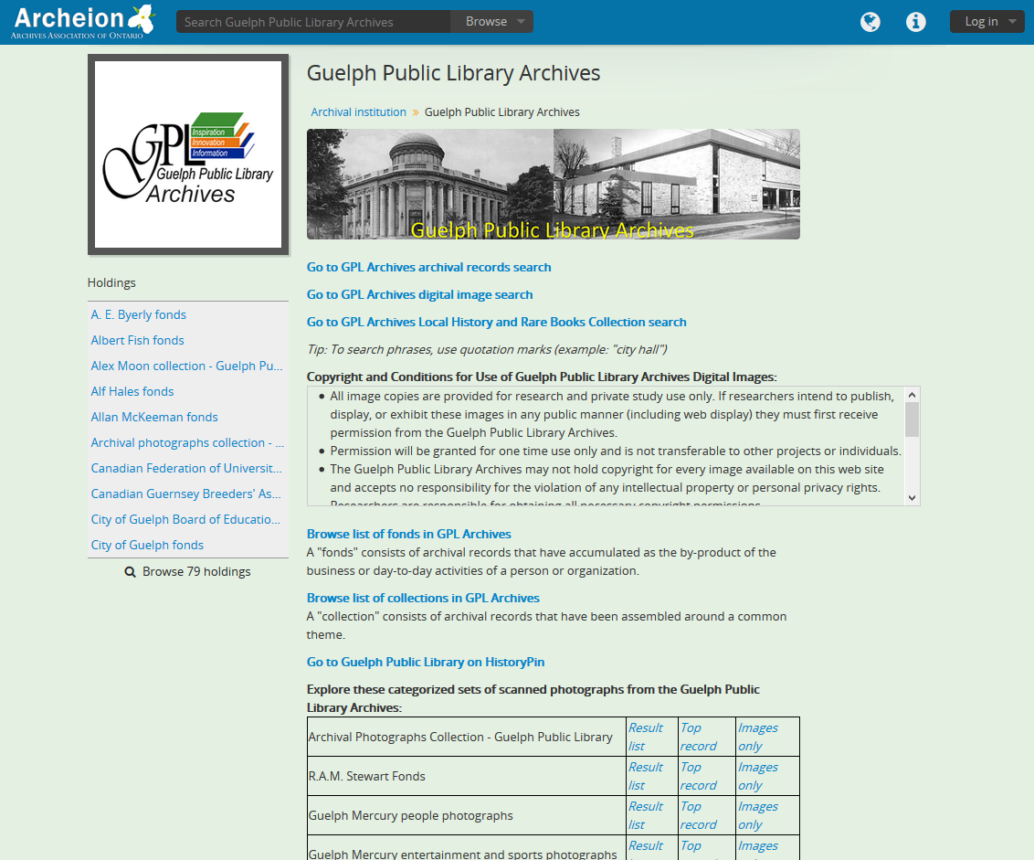 The Guelph Public Library Archives has extensively customized their content in Archeion, the Archives Association of Ontario’s portal site. See it here.