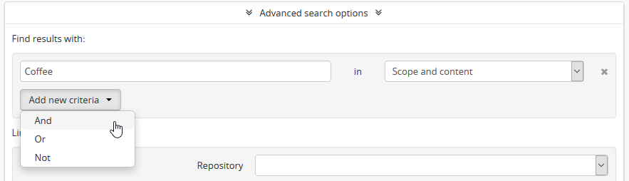 - Use the “Add new criteria” button to build multi-part queries with Boolean search operators via the user interface - by using these operators, you can narrow your search, combine terms, or exclude terms. AtoM will add a new set of fields below, into which you can enter your terms - repeat steps 3-5 as necessary. You can use the X to the right of the fields to remove a row of fields from your Boolean query if needed.