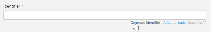 - In the Identifier field, you can automatically generate an identifier if desired, based on the settings defined in Admin > Settings - for more information, see: Identifier mask. Click the “Generate identifier” link beneath the identifier field, and AtoM will populate the field with a unique value based on the identifier mask settings.