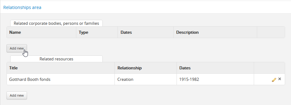 - The related archival description will now appear in the Related resources table of the Relationships area. Click the pencil icon to re-open the pop-up dialog and edit the relationship, or click the X icon to remove the relationship link. You can also repeat this process to add multiple links by clicking the “Add new” button below the Related resources again - AtoM will open a new pop-up dialog. Repeat steps 3-7 as needed. If more descriptions have been linked than the global results per page setting (which defaults to 10 in new installations), AtoM will add a pager - you can click “Show more” button below the list of linked descriptions to load the next set