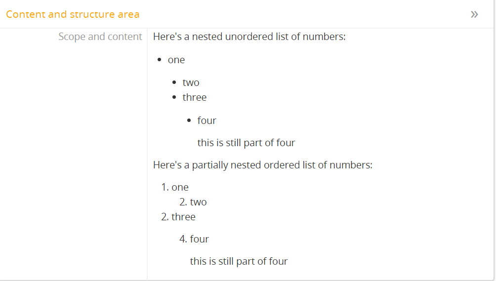 In the escaped part of this example below, leading and trailing spaces are shown with with dots: . This is just to illustrate the number of spaces required for proper rendering - you do not need to use dot characters to indent lists - in fact, it won’t work if you do! In the rendered version shown in the screenshot below, the dots have been removed, and spaces are used instead, as AtoM expects for proper rendering.