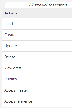 The “Archival description permissions” tab will display the specific access privileges that can be maintained for users interacting with an archival institution’s archival descriptions. Specific privileges can be set with regards to reading, creating, updating, deleting, viewing drafts, publishing, accessing master copies and/or accessing reference copies of either all archival descriptions, specific archival descriptions, or all archival descriptions of a specific institution.