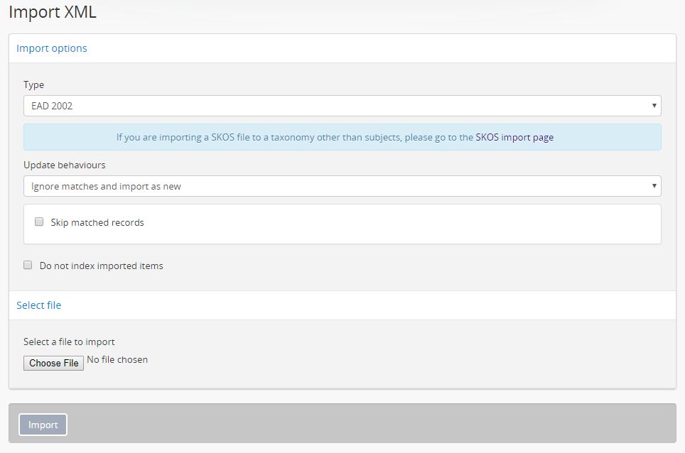 2. If you are importing EAD 2002 XML, then AtoM contains some additional import options, described in steps 5-6 below. If you are importing MODS or DC XML, you can skip ahead to step 7.