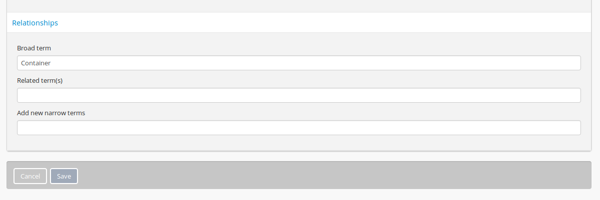 By clicking on the Relationships area, the term’s placement in the hierarchy can be altered and new narrow terms can be added: