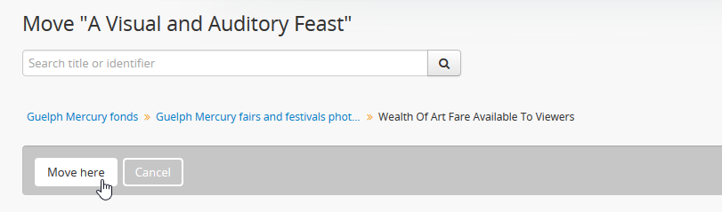 1. The blue hyperlinks allow Users to drill down into the hierarchy of the archival description selected. Clicking on a top-level description in the Move page will display the description’s lower levels of description - for example, clicking on a fonds would reveal the series or sous- fonds below it, and clicking on the series would then reveal the files below it. To orient yourself, a breadcrumb trail will appear above the list of potential archival descriptions, indicating where in the archival unit’s you are currently located - this is intented to help Users understand if they are moving the record to a sous-fonds, series, sub-series, or a file.