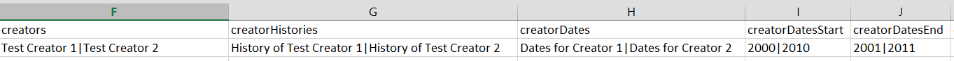 As of AtoM 2.2, creation events columns have been added as well. The creationDates, creationDatesStart, and creationDatesEnd columns can be used similarly to those in the archival description CSV templates - The creationDates field will map to the free-text date field in AtoM, where users can use special characters to express approximation, uncertainty, etc. (e.g. [190-?]; [ca. 1885]), while creationDatesStart and creationDatesEnd should include ISO-formatted date values (YYYY-MM-DD, YYYY-MM, or YYYY). The creationDatesType column will accept two values - either creation or accumulation .