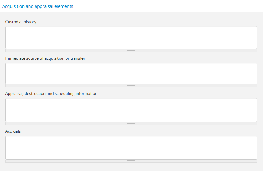 The data entry fields for the conditions of access and use elements of the DACS archival description edit template.