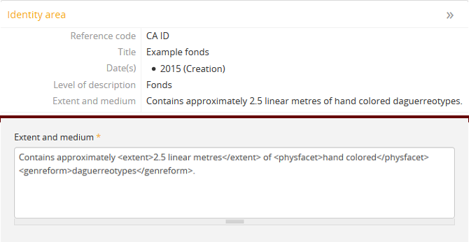 AtoM will allow users to add additional EAD subelements to field in the edit page to accommodate all the possibilities in EAD for more granularity, such as <extent>, <dimensions>, <physfacet>, and <genreform>. In the view page the EAD tags will be hidden, but preserved during export and re-import.