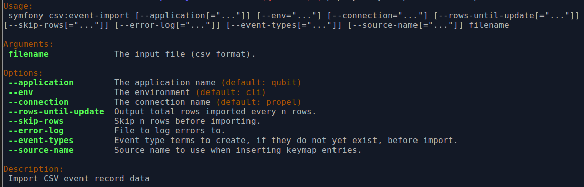By typing php symfony help csv:authority-import into the command-line from your root directory, without specifying the location of a CSV, you will able able to see the CSV import options available (pictured above). A brief explanation of each is included below.