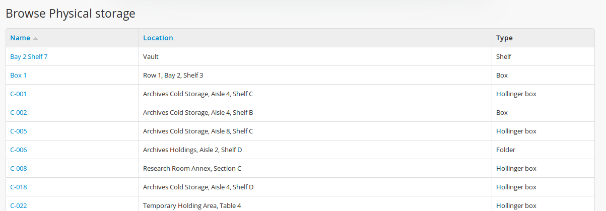 From here users can click on a hyperlink container name and AtoM will take you to the View physical storage screen.