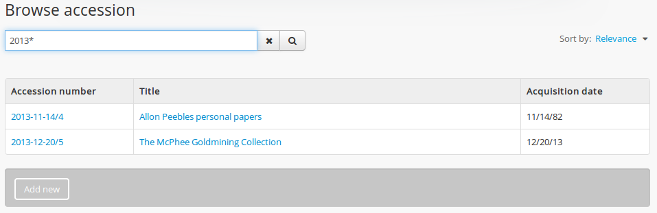 For more information on locating Donor records, see above, Edit an existing donor record. For information on locating accession records, see: Edit an existing accession record. For general information on navigation in AtoM, see: Access content