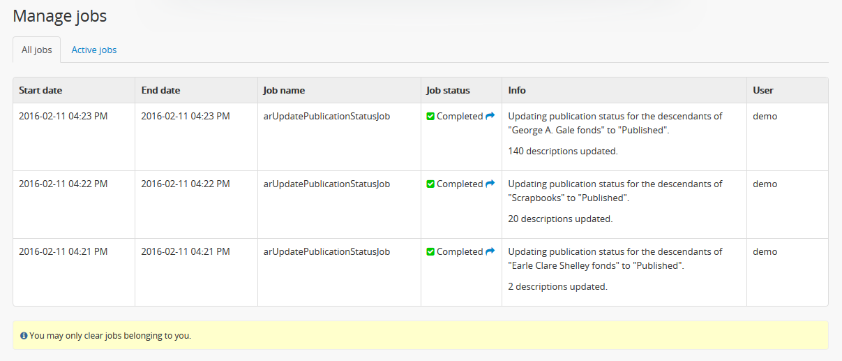 To avoid timeouts via the web browser for large publication status requests, updates to descendants are performed asynchronously in the background via AtoM’s job scheduler. For example, when a user publishes a draft fonds and selects the “Update descendants” checkbox as well (so all lower-level records in the fonds will be published as well), the fonds-level record will be immediately updated, while the job scheduler will begin the task of updating the descendants in the background. In this case, a notification will appear at the top of the archival description view page when the user is redirected to it after submitting the update request, with a link to the Jobs page, where more information about the status of the job can be seen. In most cases this will be very rapid, but for exceptionally large requests it is possible for a user to navigate to a descendant record (e.g. an item in the fonds) before the update job has been completed. If you’re unsure if your publication status update job has executed properly or not, be sure to check the jobs page. For more information on the Jobs page in AtoM, see: Manage jobs.