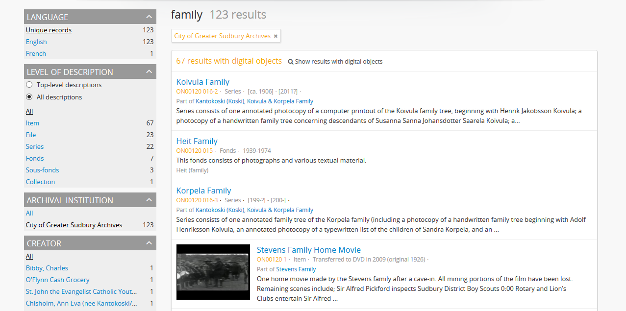 • Creator name - if a creator’s authority record has been linked to an archival description, the results stub will display the creator name below the scope and content summary.