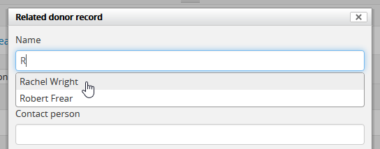 • Name - an autcomplete field where you can link to an existing donor record or enter a new name to create a new donor record.