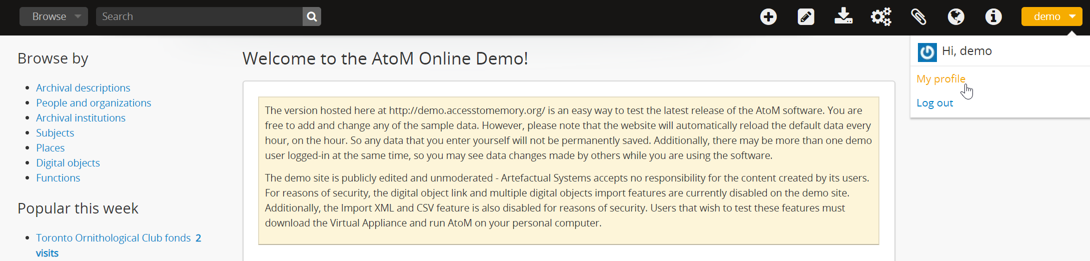 1. By clicking on the username of the user you wish to edit, AtoM will direct you to that user’s profile view page.