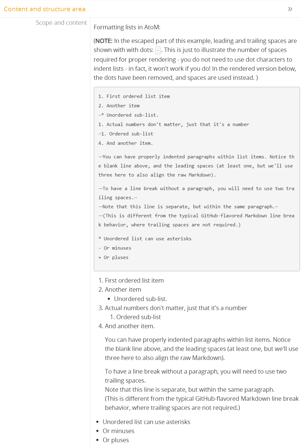 In the escaped part of this example below, leading and trailing spaces are shown with with dots: . This is just to illustrate the number of spaces required for proper rendering - you do not need to use dot characters to indent lists - in fact, it won’t work if you do! In the rendered version shown in the screenshot below, the dots have been removed, and spaces are used instead, as AtoM expects for proper rendering.