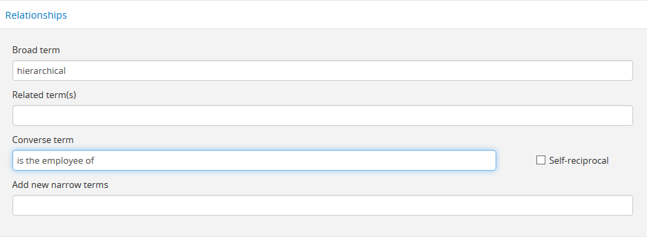 1. If the term is self-reciprocal, simply check the checkbox next to the converse term field. AtoM will grey-out the field: