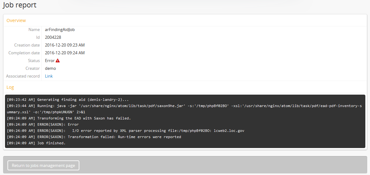 The AtoM Jobs page can possibly supply you with more information on any errors encountered, as finding aid generation is a job handled asynchronously in AtoM. For more information on the Jobs page, see: Manage jobs.