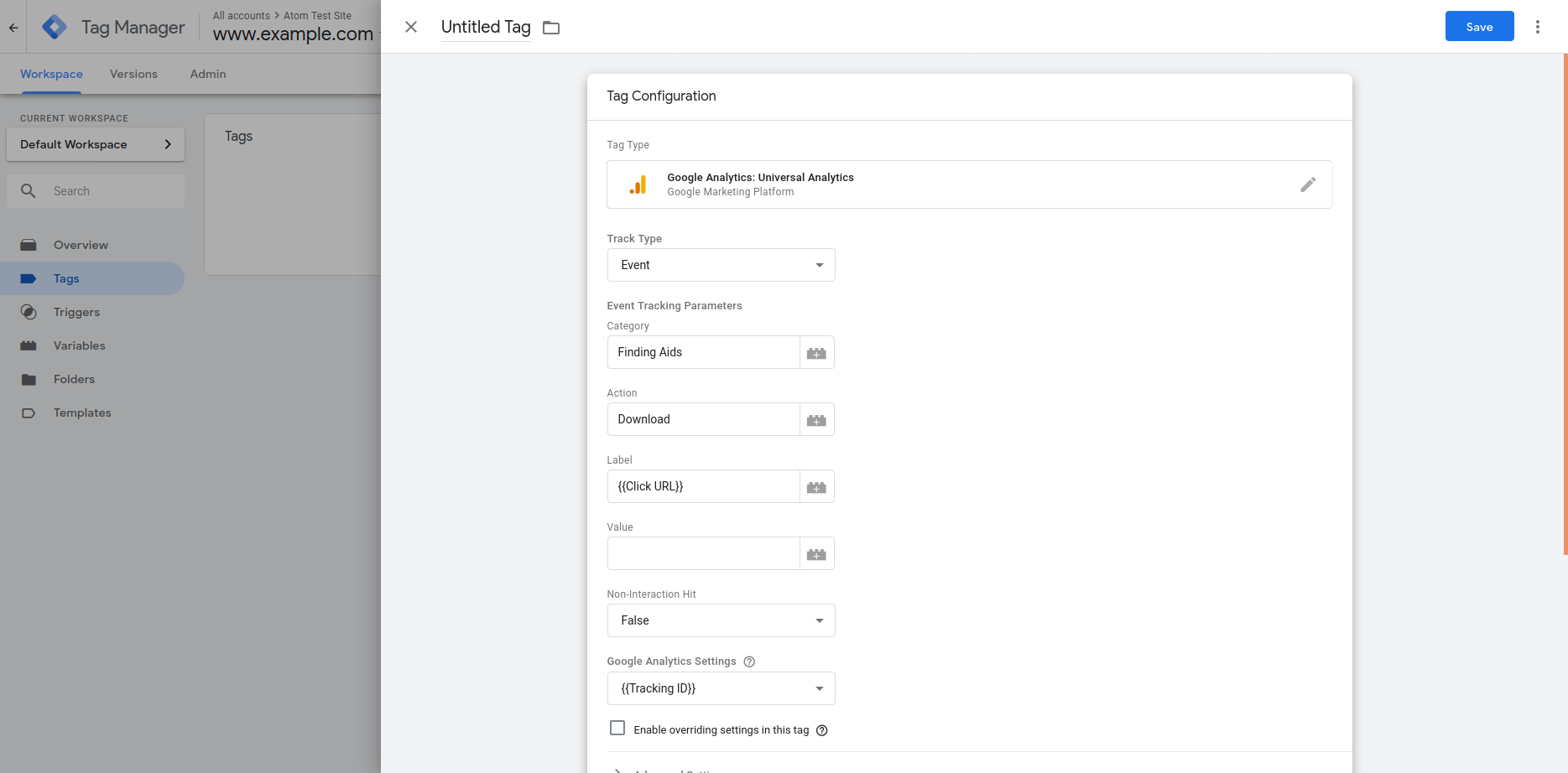 1. Finally, name your tag “Finding Aids Download” and click the Save button at the top of the screen.